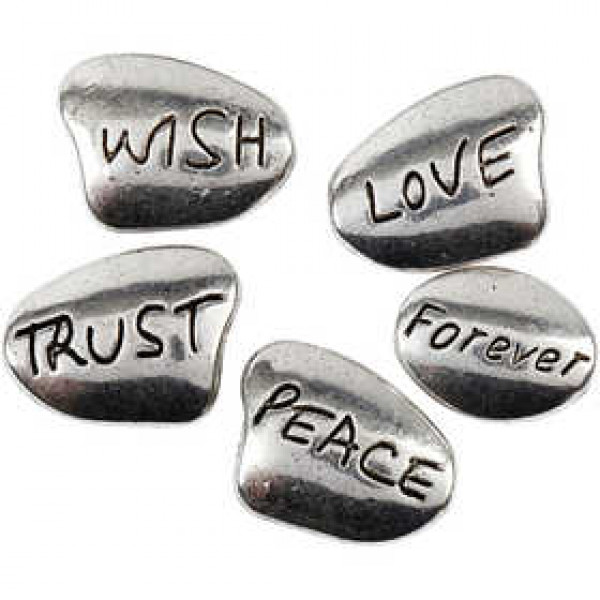 Metallperlen mit Text (beidseitig mit unterschiedlichem Text, z.B. 'love/wish', 'peace/trust').