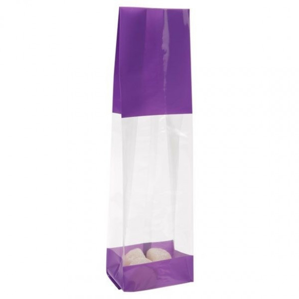 Create a festive mood with this clear side gusseted bag with purple highlights. The G2PL measures 67 x 48 x 273 mm and is designed with a purple top and bottom. This bag works well for favors and gifts. Fill this bag with candy, chocolates, confections, beauty products, and more. Side gussets expand for bulky products that require extra space. The center of the bag is transparent for a clear display of your product. The material is made of laminated material for exceptional clarity and bottom-sealed for added strength. Easily jazz up this bag even more with accessories like ribbon, bows, and twist ties. This bag is heat sealable for a tamper-proof closure.