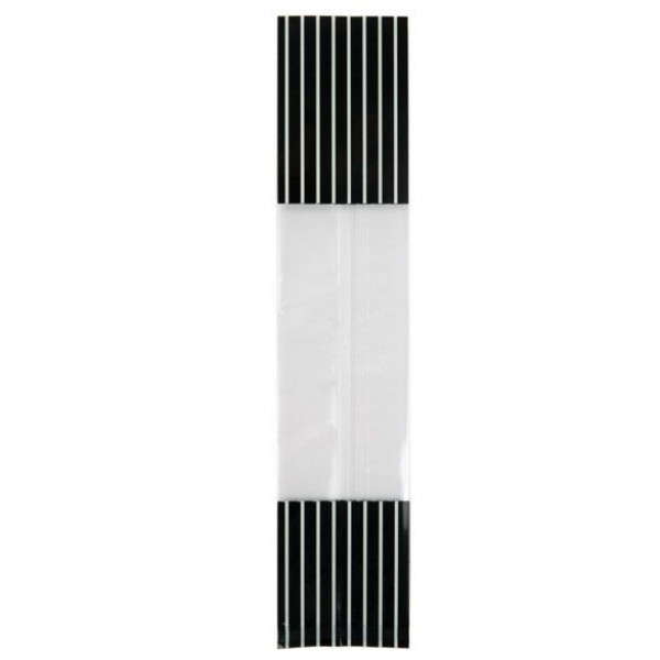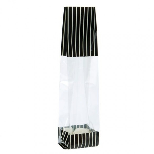 Printed Gusset Bags are a fun way to celebrate weddings, birthdays, holidays, and special events. The G1BKC measures 51 x 48 x 241 mm and is designed with a black and cream stripes print at the top and bottom of the bag. The clear center reveals what's inside the bag and provides a stunning presentation. Fill this bag with treats such as chocolates, confections, taffy, and more. The laminated material and bottom-seal provide added durability. Expandable sides allow for extra room for bulky products. This opened-ended bag can be accessorized and closed with bows or ribbons. For a more secure closure, this bag is heat sealable.