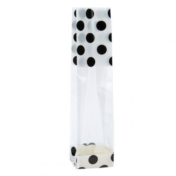 A playful polka dot design is a great match for gifts and favors. The G1WB is designed with a white with black polka dots print on the top and bottom of the bag. The center of the bag is crystal clear to show off your product. Fill this 4 micron bag with candy, treats, and gifts. The material is made from laminated material and is bottom-sealed for extra strength. Not only is this 1.6 mil bag durable, but it also has expandable side gussets to accommodate your product. Dress up this festive bag with ribbons or twist ties. Heat seal with a standard hand sealer for a more secure closure.