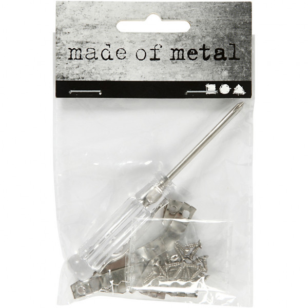 Packung mit 10 Halterungen, 20 Schrauben und 1 Schraubenzieher.