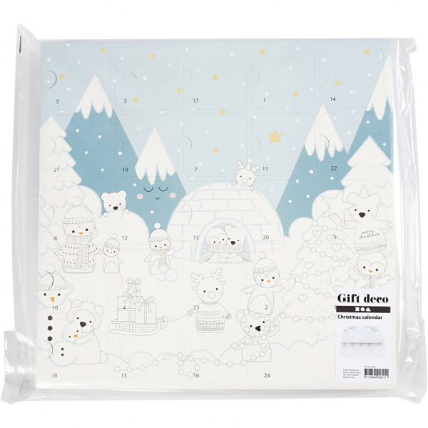 Adventskalender aus weißem Karton mit 24 Türen zum Öffnen - Front und Seitenteile mit Motiven bedruckt, die ausgemalt werden können.