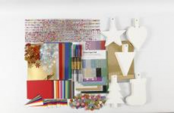Inhalt: 120 Blatt Karton, 30 Blatt Metallic-Karton, 24 x Glitzerkleber in verschiedenen Farben, 20 Blatt Gold- und Silberpapier, 100 weiße Weihnachtskarten, selbstkelbende Strassteine, 400 Papierstreifen, funkelnde Figuren aus Moosgummi.