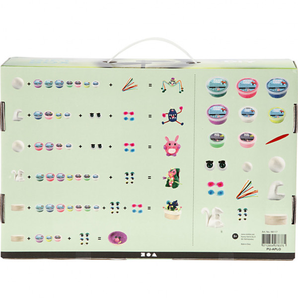 Inhalt: 1 Tier und andere Teile aus Styropor, 1 Box mit Holzfurnier, Foam Clay® und Silk Clay® in sortierten Farben, Chenille- Draht und 5 Paar Augen.