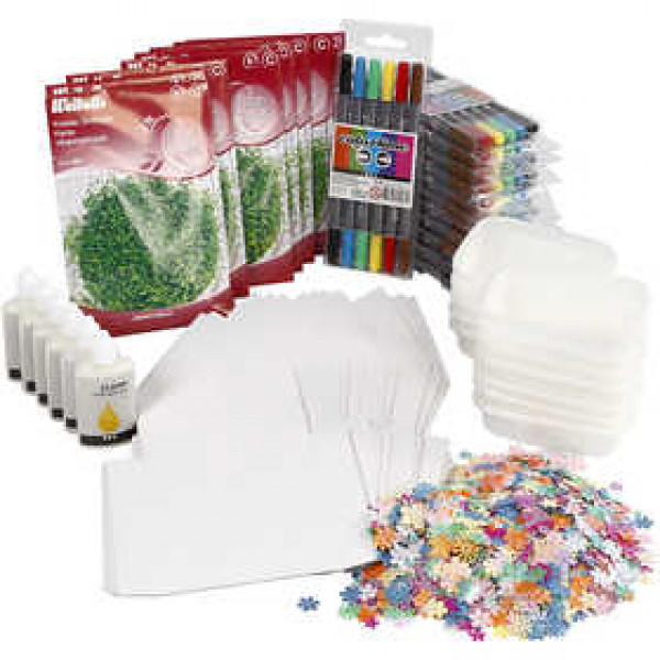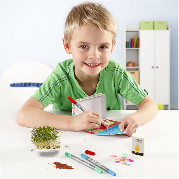 Inhalt: 24 Tabletts für Kresse, 8 Säckchen Kressesamen, 12 Packungen Colortime Marker, Blumen-Pailletten und 6 Kleber Clear Multi Glue Gel.