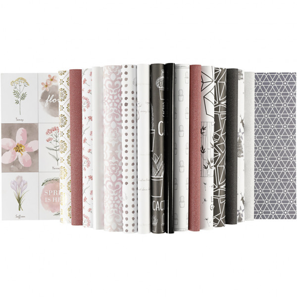 36 Blätter = einseitiger Druck (128 g/m²): 3 x 2 Lack und 3 x 2 Glitter, einseitiger Druck (120 g/m²): 2 x 2 mit Metallfolie in Gold, 20 sort. Blätter in 10 verschdn. Prints.