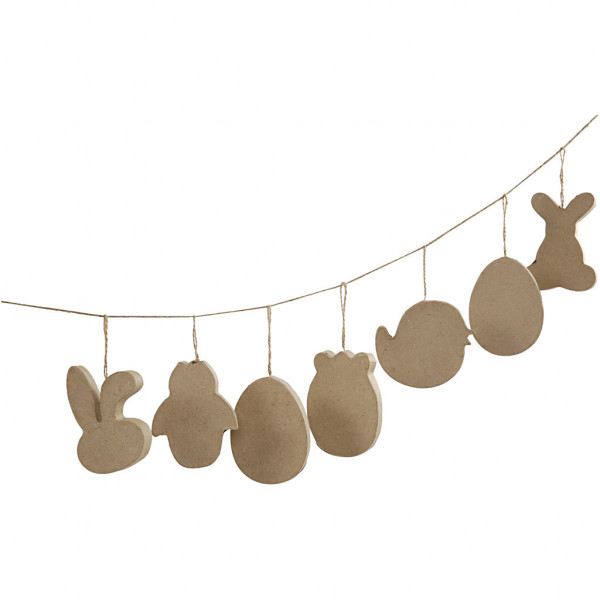 Handgearbeitete Osterfiguren aus Pappmaché mit Leinenkordel zum Aufhängen.