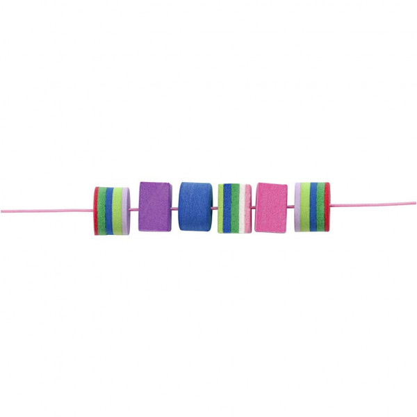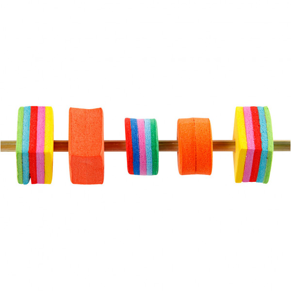 Große Perlen in verschiedenen Formen aus Moosgummi mit großem Loch - rund, quadratisch, gestreift, einfarbig.
