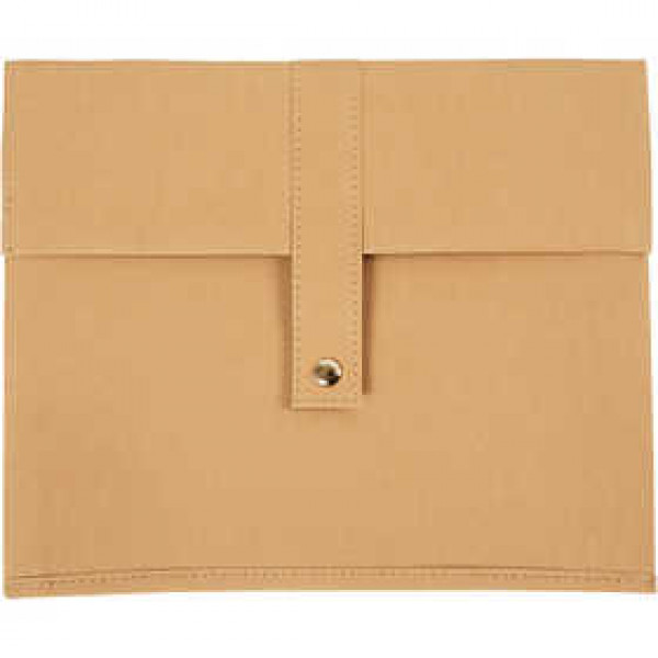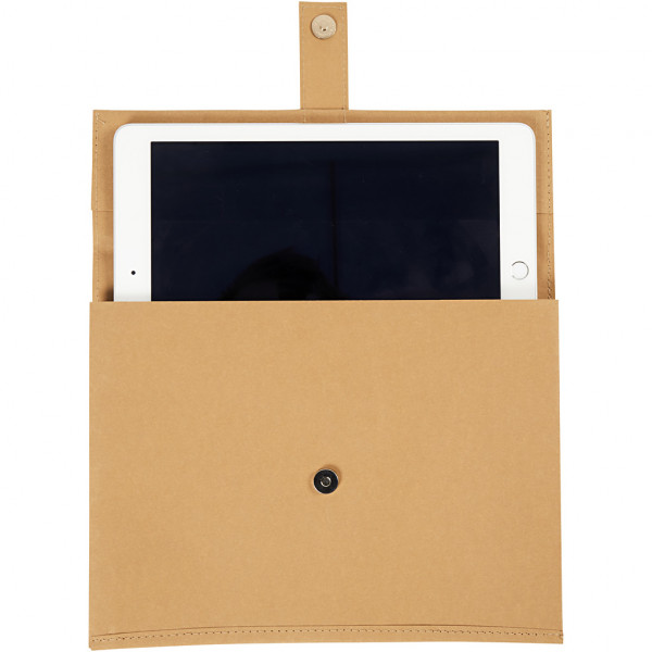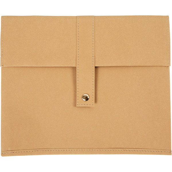 Tasche aus kräftigem Lederpapier - passend für Tablets etc. - mit Klappenverschluss und goldfarbenem Nietknopf.