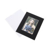 What better way to make a photo or print stand out than with a mat. MS40003 measures 203 x 254mm in size and features a 114 x 165mm opening. Slip-in mats are top loading and do not require tape or glue to secure photos in place. A thumb notch is located at the top to allow prints to slip-in easily. This mat is black in color and features a white core. A 45 degree bevel-cut opening frames your photo perfectly. Acid Free.