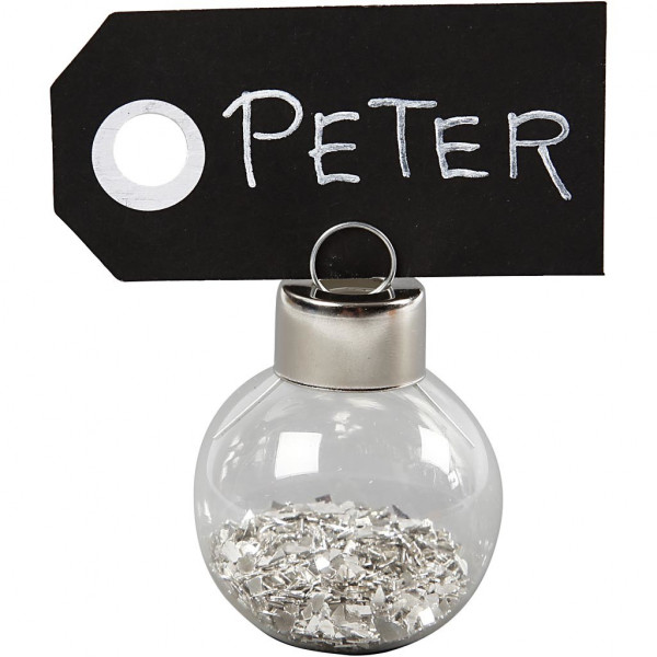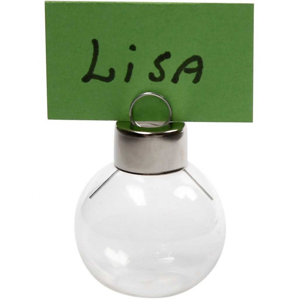 Zarte Klarglaskugel mit flachem Boden und Metalllöse für eine Kordel oder zum Anhängen einer Grußkarte.