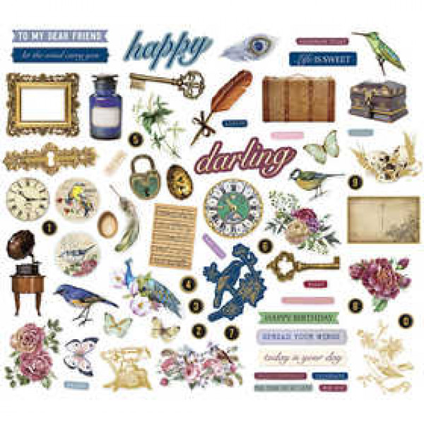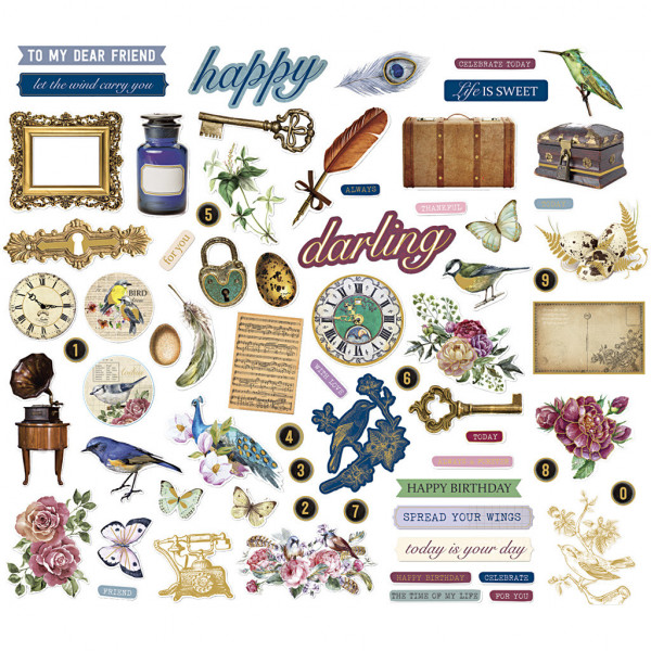 Kleine gestanzte Etiketten - verschiedenste Motive, Formen und Größen - alle farbig, einige mit Goldfolie - geeignet zur Dekoration und für Scrapbooks.
