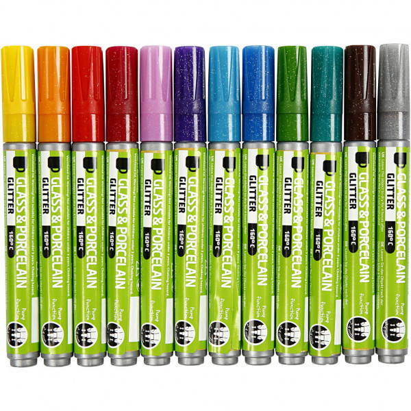 Glas- und Porzellanmalstifte, Strichstärke: 2-4 mm, Sortierte Farben, Glitzer - halbdeckend, 12Stck. [HOB-31312]