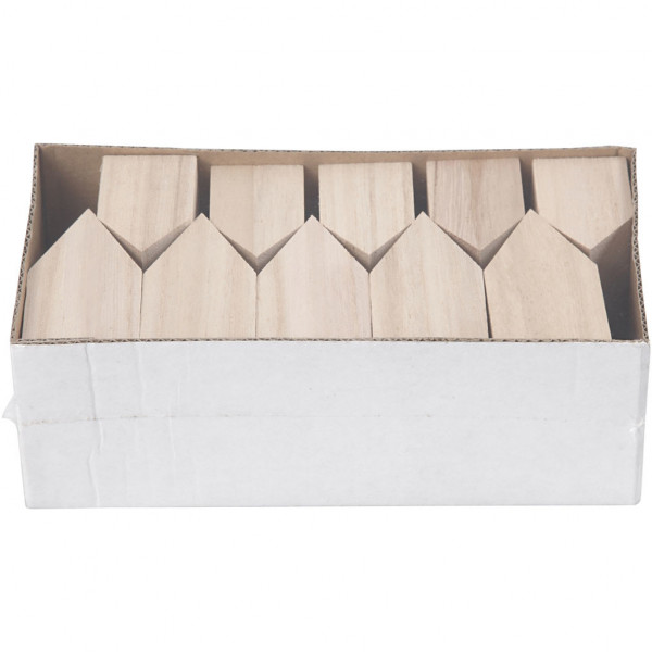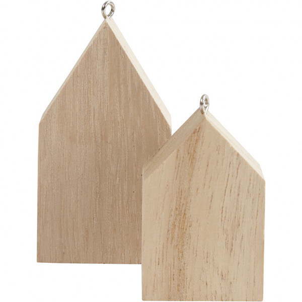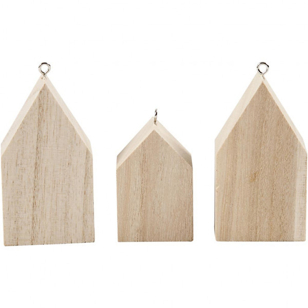 Kleine Häuser aus hellem Holz mit kleiner Metallöse zum Aufhängen.