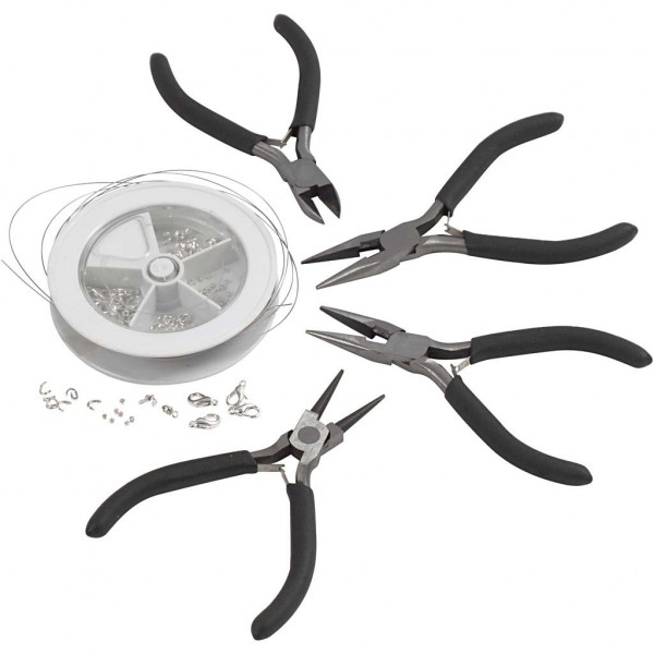 Inhalt: 4 sort. Schmuckzangen, 5 m Schmuckdraht und 4 versch. Schmuckteile - insgesamt 100 sort. Teile.