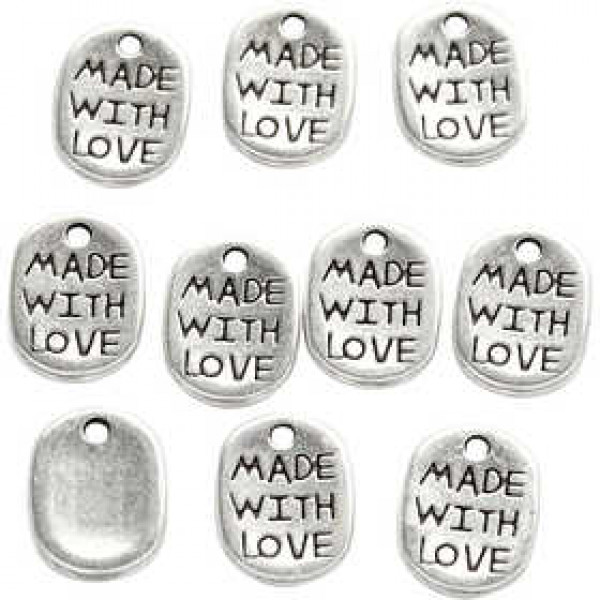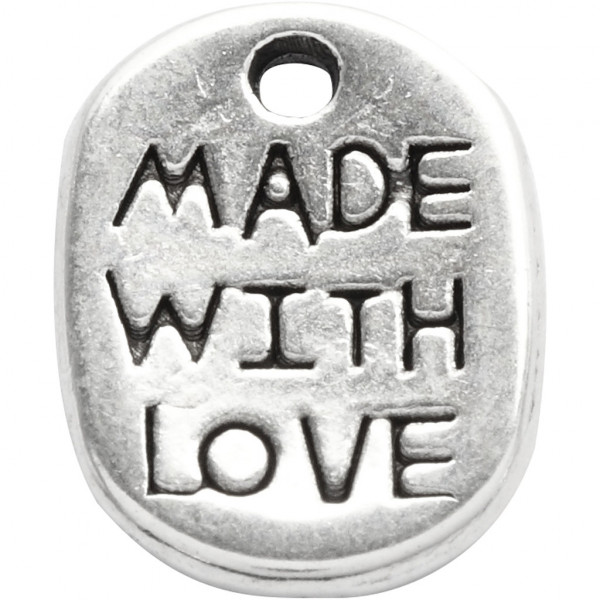 Metallanhänger in Form eines oval-runden Amuletts mit Löchern zum Aufhängen und eingeprägtem Text 'MADE WITH LOVE'.