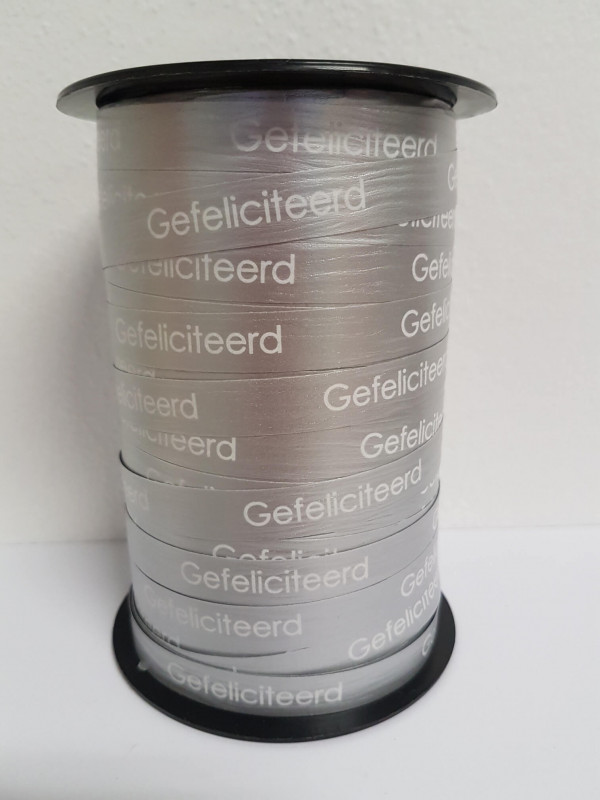 Poly Kräuselband 10mm Breit mit Gefeliciteerd darauf gedruckt.