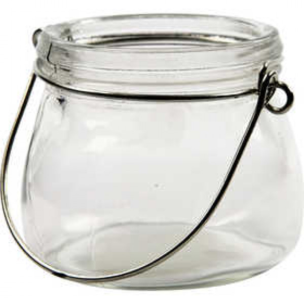 Bauchig - Klarglas - mit Aufhängebügel aus Metall.