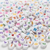 Runde Perlen aus weißem Kunststoff mit flacher Vorder- und Rückseite - bedruckt mit bunten Buchstaben des Alphabets, Zahlen oder roten Herzen.
