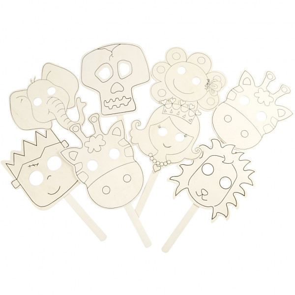 Holzmasken mit Augenschlitzen, Griff und aufgemalten Details. Packung mit 8 verschd. Designs á 2 Stück.