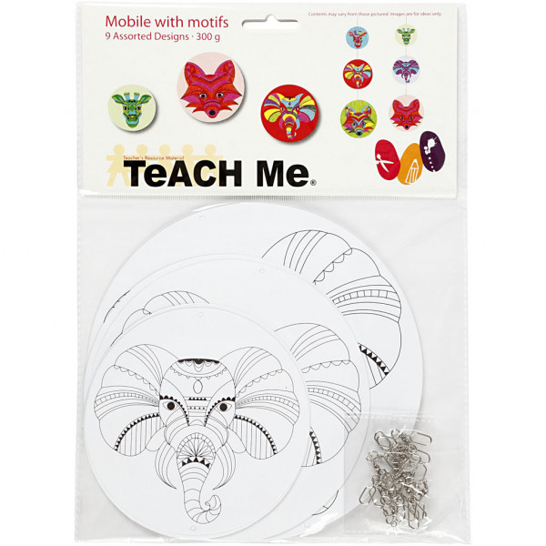 Packung: 3 Motive in 3 Größen, insgesamt 9 Teile mit 9 Metall-Verbindungsteile. Die sich drehenden Verbindungsteile gewährleisten, dass die Scheiben frei beweglich und unabhängig voneinander am Mobile hängen.