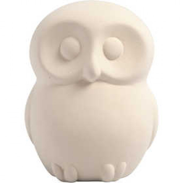 Spardose in Eulengestalt - rohes, weißes Terrakotta - mit Gummistopfen im Boden.