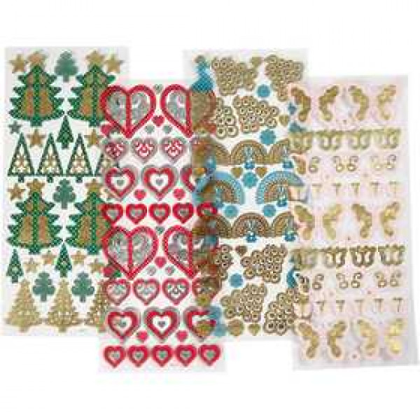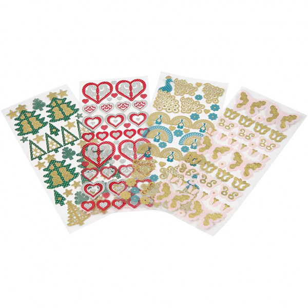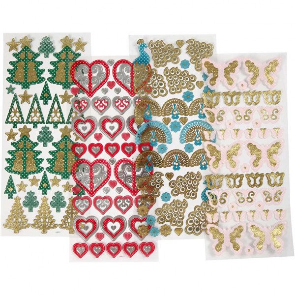 Sortiment von selbstklebenden Folienaufklebern mit 3D- und Glittereffekt.
