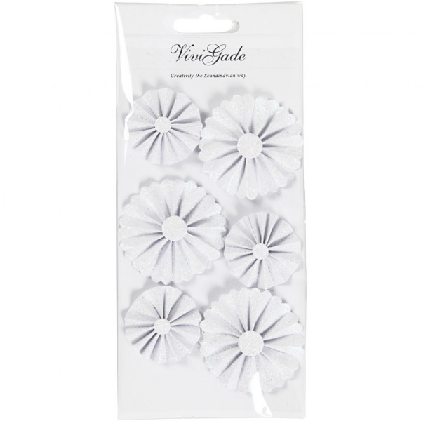 Papier-Rosetten, D: 35+50 mm, Weiß mit Glitter, 6Stck. [HOB-24782]