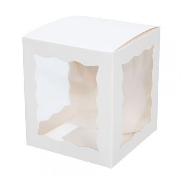 Our Kraft boxes with ornate windows provide an upscale look for baked goods. The WGWG349 white Kraft Box with ornate windows measures 10.2x10.2x11.7 cm and is designed to hold a single cake pop. A clear 3-sided window gives customers a view of what's inside the box while the scalloped edges offer a sophisticated touch. An optional hole at the top provides an opening for a dessert stick or can remain closed to package mini cupcakes, bite-size cookies, or loose candy. The interior lining offers a grease-resistant surface for easy loading of baked goods. Assembly is easy with an auto-forming bottom that snaps into place. Shape box along soft folds. FDA approved.