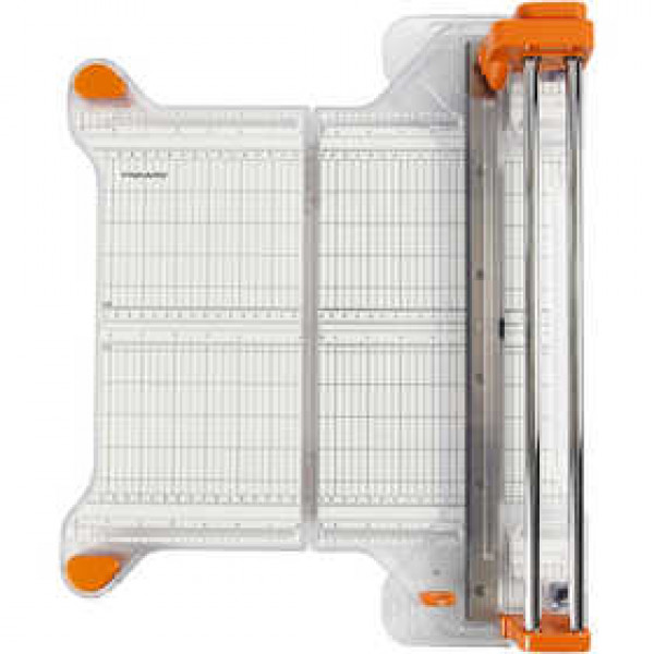 Tragbares Roll-Schneidegerät von Fiskars - Oberfläche und Skalen aus Plastik - schneidet mehrere Bl. Papier gleichzeitig.