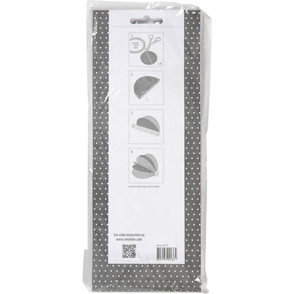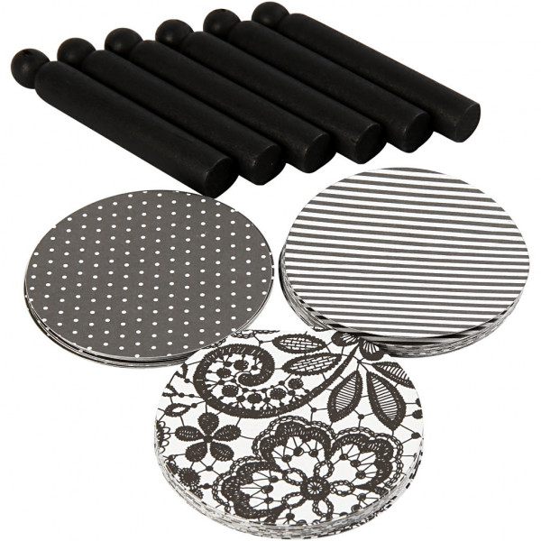Packung mit 48 Kreisen in 3 verschiedenen Designs á 2 St. und 6 St. Wäscheklammern zum Montieren. Anleitung wird mitgeliefert.