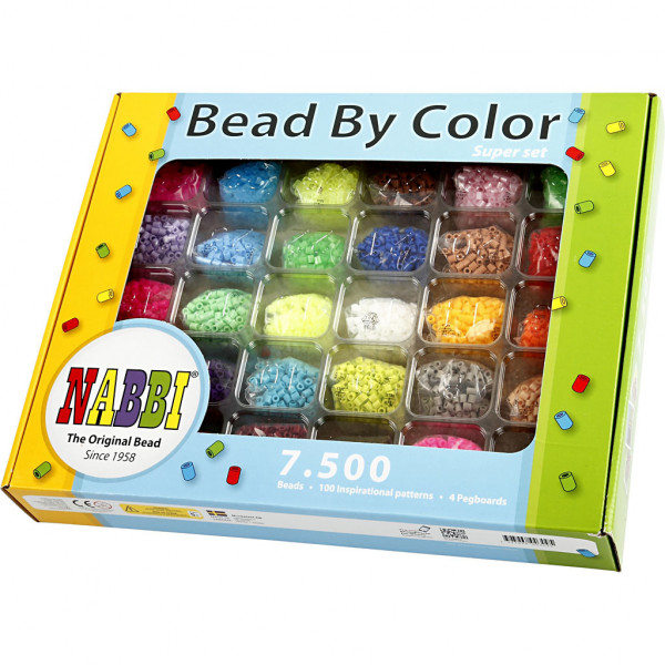 Lieferung in Sortimentsschachtel mit 30 Fächern und transparentem Plastikdeckel, 7500 sort. Bügelperlen, 4 Stck. Steckplatten und Inspirations-CD.