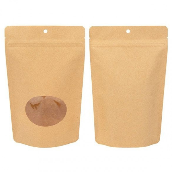 Standbodenbeutel Kraft Kompostierbar 14,9x8,9x23,2cm | 113 Gramm mit ovalem Fenster (100 Stück) [ZBGEO7K]