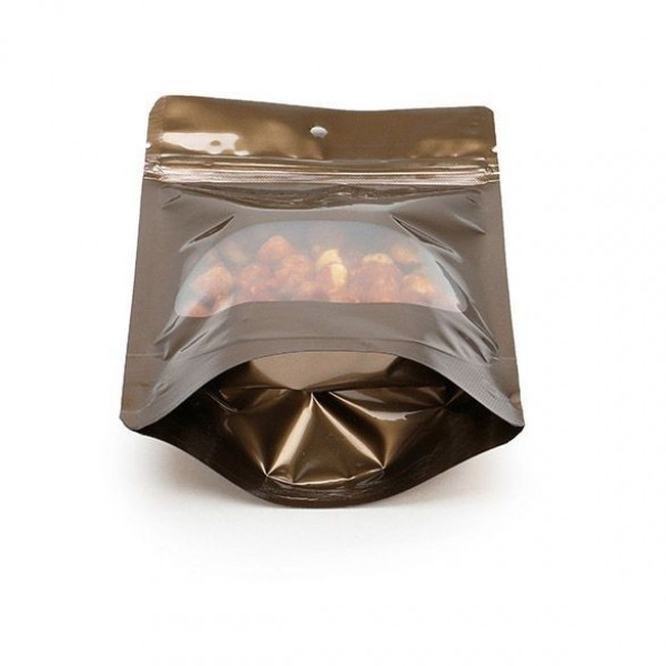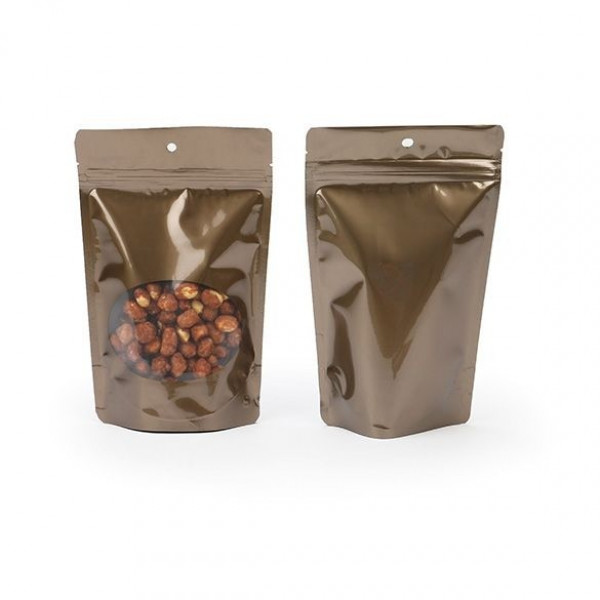 Standbodenbeutel Bronze 13x7x20,5cm | 113 Gramm mit ovalem Fenster und rundes aufhängeloch (100 Stück) [ZBGO3BZH]