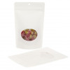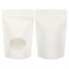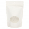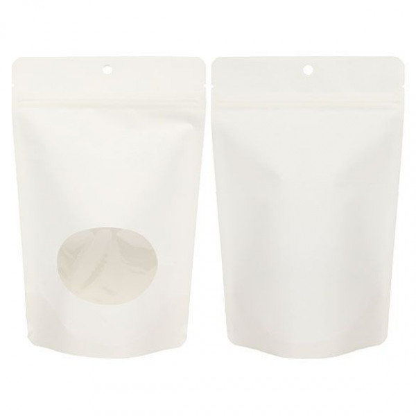 Our White Kraft Eco Stand Up Zipper Pouch with Oval Window is your eco-friendly alternative for food packaging. Our ZBGEO7W pouch is designed with a clear oval window to showcase your product and measures 14.9 x 8.9 x 23.2 cm This pouch holds 312 g of grains, pasta, powdered mixes, coffee, candy, pet treats, and more. The material is made of 65 gsm Kraft paper and has a laminated interior derived from PLA plant-based material and an ALOX coating. This pouch offers a high moisture and oxygen barrier, making it an excellent choice for food products. Includes a resealable zipper, tear notches, and a round hanging hole.