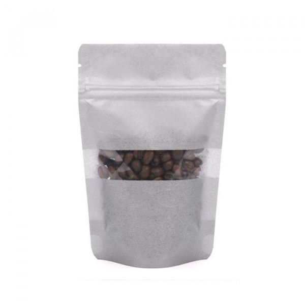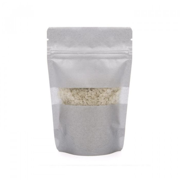 Measuring 102x60x152mm, this rice paper pouch is ideal for packaging non-refrigerated items like candies, salts, sprinkle mixes and more. Stand Up Zipper Pouches feature a self-supporting pouch design that makes them perfect for retailer's shelves. The fiber pattern on this shiny silver bag gives it an earthy feel, while providing a more upscale look than a traditional paper pouch. ZBGR2S has usable space that measures 90 x 50 x 120mm and holds 57 g of dry goods (based on whole coffee beans). The resealable zipper will help keep products fresh, while the clear rectangular window on the front will show off products. Heat seal using a standard hand sealer to provide a tamper resistant closure. Tear notches are located above the zipper for convenient access once sealed closed.