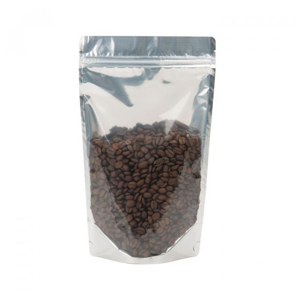 Stand Up Zipper Pouches draw customers in with their convenient features and self-supporting design. Our ZBGB2 bags measure 102x60x152mm and have usable space of 90 x 50 x 120mm. These pouches hold 2 ounces/57 grams (based on whole coffee beans) of dry goods and are ideal for snacks, mixes, coffee, tea, nuts, spices, and bath salts. This pouch has a black finished back with a clear front panel and silver interior. A blend of laminated food safe material provides a high odor and moisture barrier. These pouches come standard with an airtight resealable zipper for freshness. Tear notches are located above the zipper and provide easy access when pouches are heat sealed.