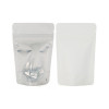 These affordably priced White Backed Stand Up Zipper Pouches provide a classy option for retail shelves. Popular for their self-supporting pouch design, our ZBGW2 pouch makes a great impression with a silver interior and clear front panel display. This pouch measures  100 x 60 x 150mm and has a usable space of 90 x 50 x 120mm. Fill this pouch with coffee, tea, candy, chips, sea salts, and more. Holds 2 oz/57 grams (based on whole coffee beans). A blend of laminated materials provide durability with 90 micron thick material and a high protective barrier. An airtight zipper provides additional freshness for your product. Convenient tear-away notches provide easy access if pouch is heat sealed. Easily brand this package by adding a label or custom print design.
