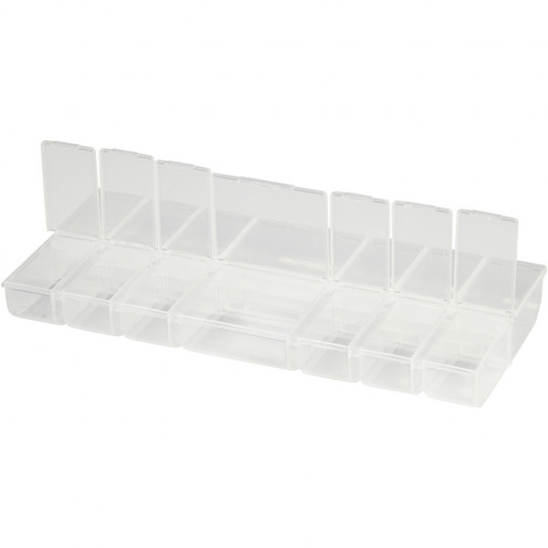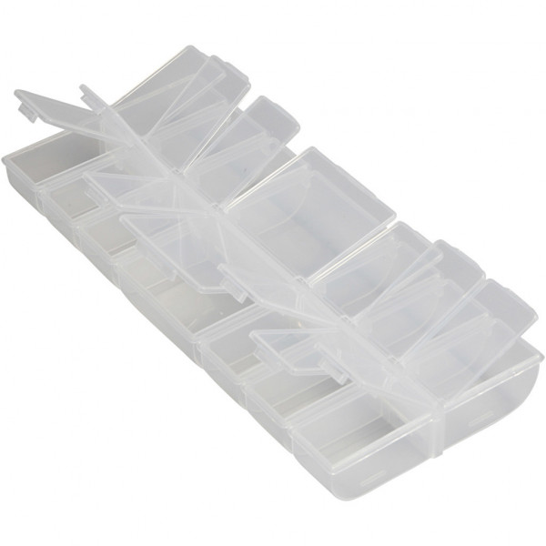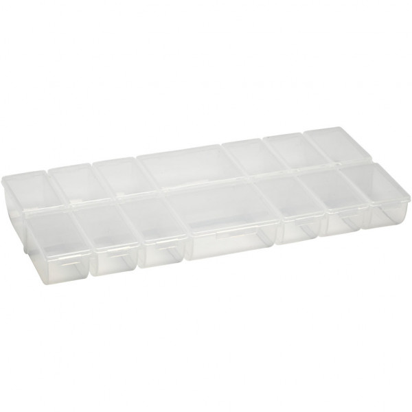Praktische Aufbewahrungsbox mit Klickverschluss-Deckeln, 12 Fächern in Größe 25 x 40 mm und 1 Fach in Gößre 53 x 45 mm.