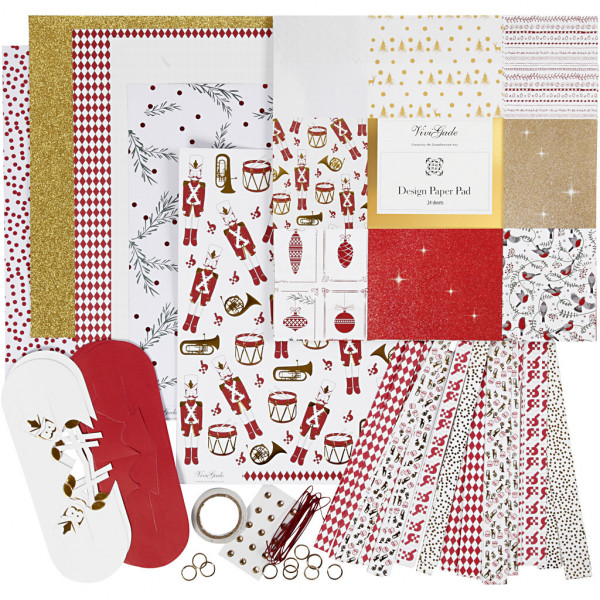 Inhalt: 2 Blatt weißer Karton, 2 Blatt Glitzerpapier, 1 Blatt Pergamentpapier, 4 Blatt Design-Papier, 4 Sets geflochtene Herzen, 48 Papierstreifen für Fröbelsterne, 3 m gewachste Schnur, Klebeband, 15 Spaltringe in Gold und Strasssteine.