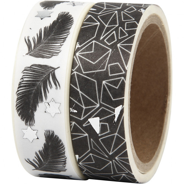 Washi Tape, B 15 mm, , Federn und graphisches Muster - Glanzfolie, 2x4m [HOB-24772]