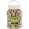 Holzperlen mit Buchstaben - im Plastikeimer.